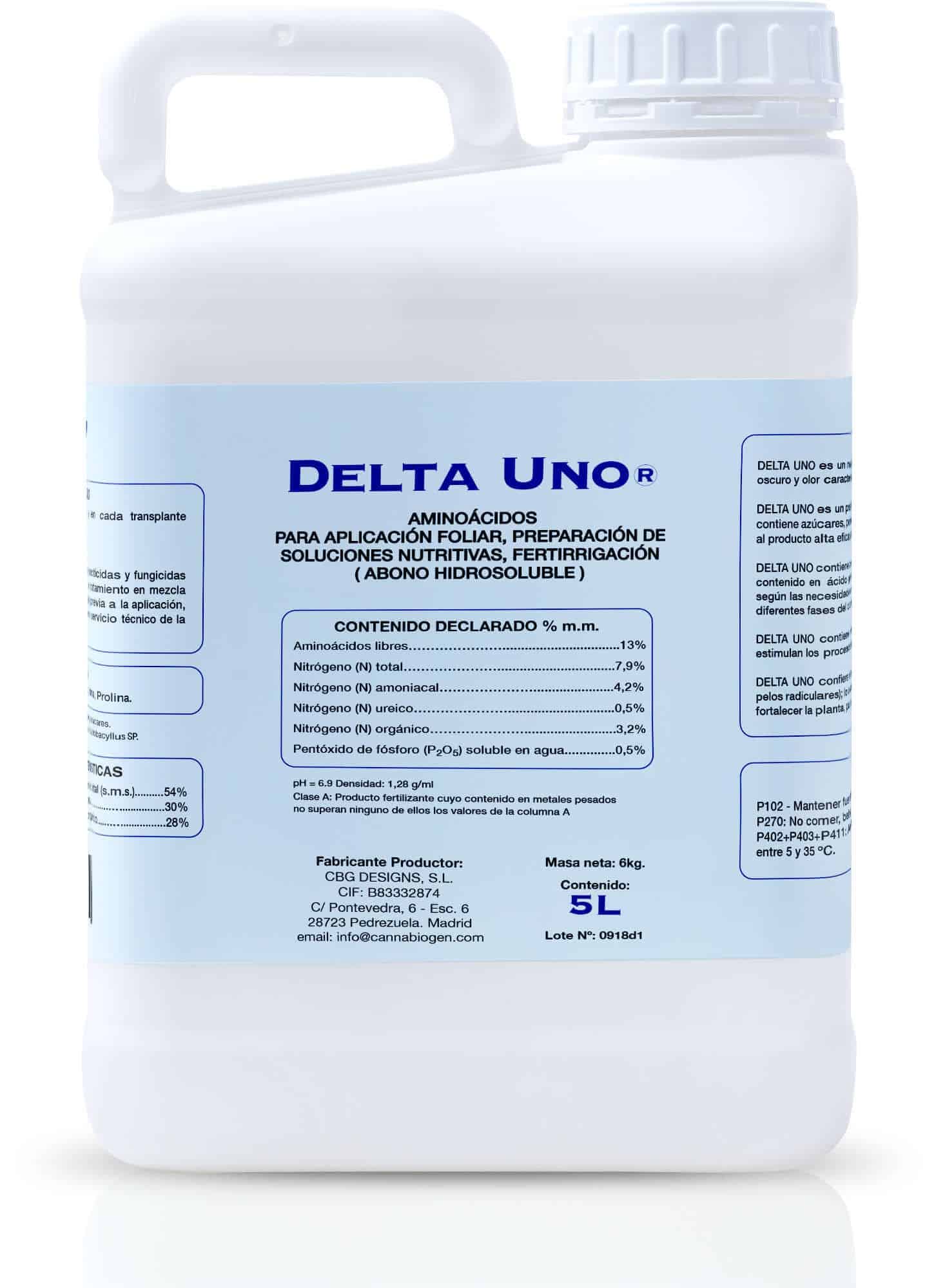 Delta 1 5L de CBG es un bioestimulante radicular avanzado formulado con los aminoácidos más importantes que necesita la planta. Su alto contenido en ácido glutámico permite a la planta sintetizar otros aminoácidos según sus necesidades específicas, logrando una respuesta rápida durante todas las fases del ciclo vegetativo. Enriquecido con vitaminas y hormonas naturales, estimula intensamente el desarrollo radicular para plantas más fuertes y resistentes.