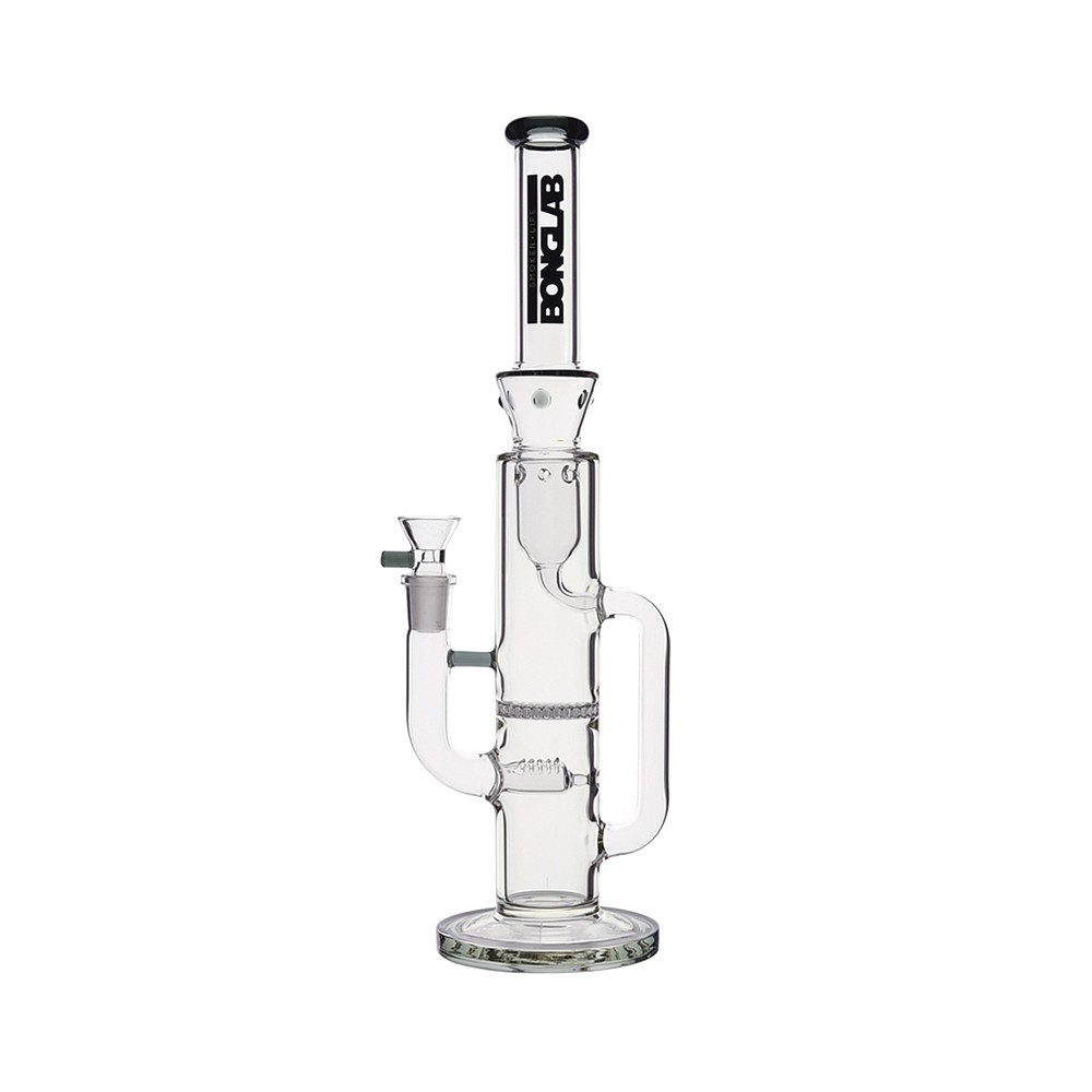 MAD PROFESSOR BLACK-BONGLAB es un bong de 42 cm en vidrio borosilicato con triple percolación (Inline + Showerhead + Crown), diseñado para máxima suavidad y filtrado. Altura 42 cm, cristal de alta resistencia y base estabilizadora; ideal para extracciones y sesiones largas.