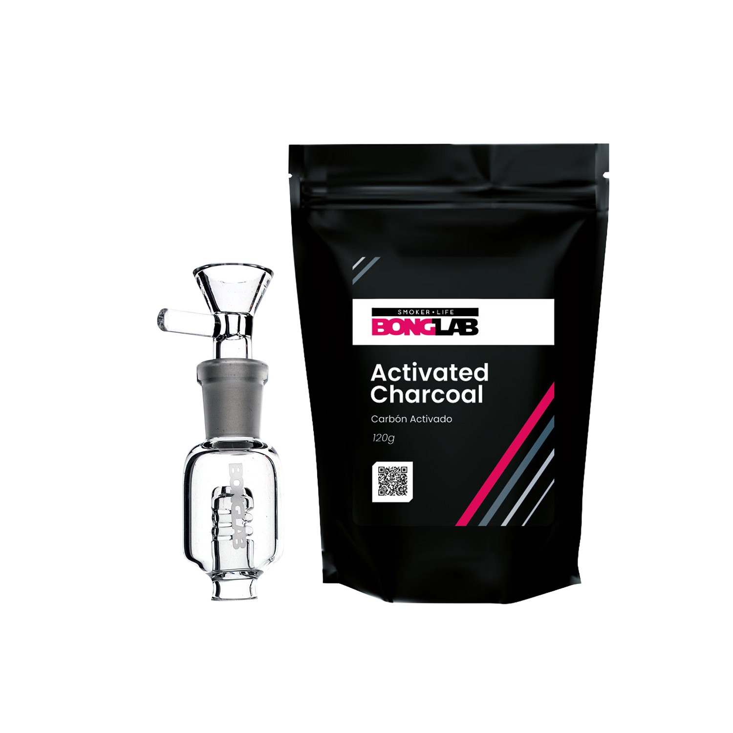 PURIFY CARBON FILTER SYSTEM KIT 14MM-BONGLAB: kit con cuerpo de vidrio borosilicato y 50 g de carbón activado de cáscara de coco. Filtrado químico para bongs 14 mm, limpieza fácil y preserva terpenos.