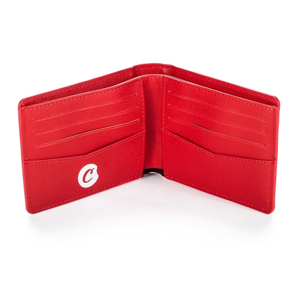 Textured Leather Red Wallet – Cookies (Nailon, Logo C-Bite) es una billetera plegable de nailon texturizado de Cookies Clothing con logo blanco exterior y sello interior “C-Bite”. Dimensiones plegada 11 x 9 cm, peso aproximado 45 g, capacidad para 4 tarjetas y un compartimento para billetes. Diseño compacto y acabado tipo cuero sintético pensado para uso urbano.